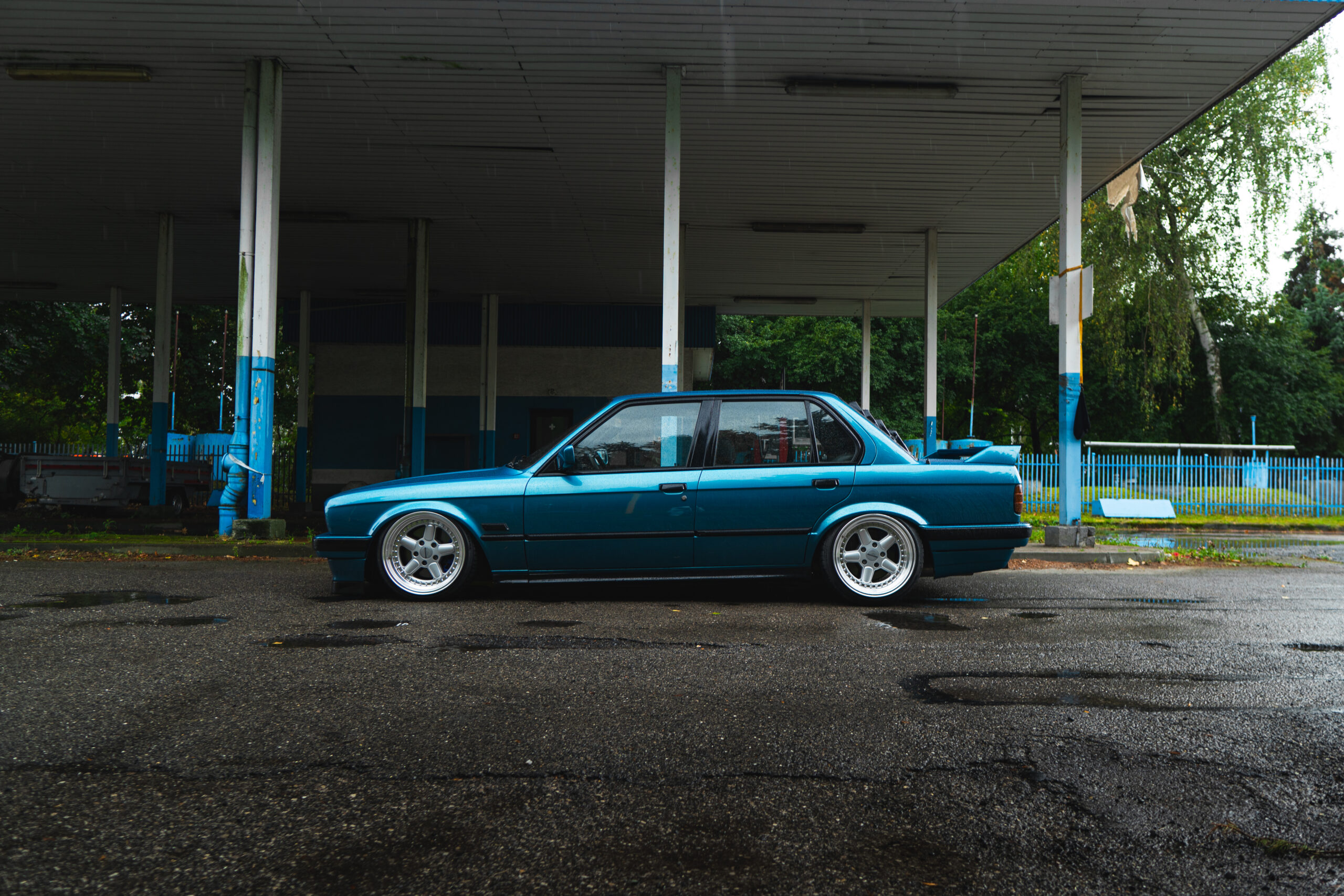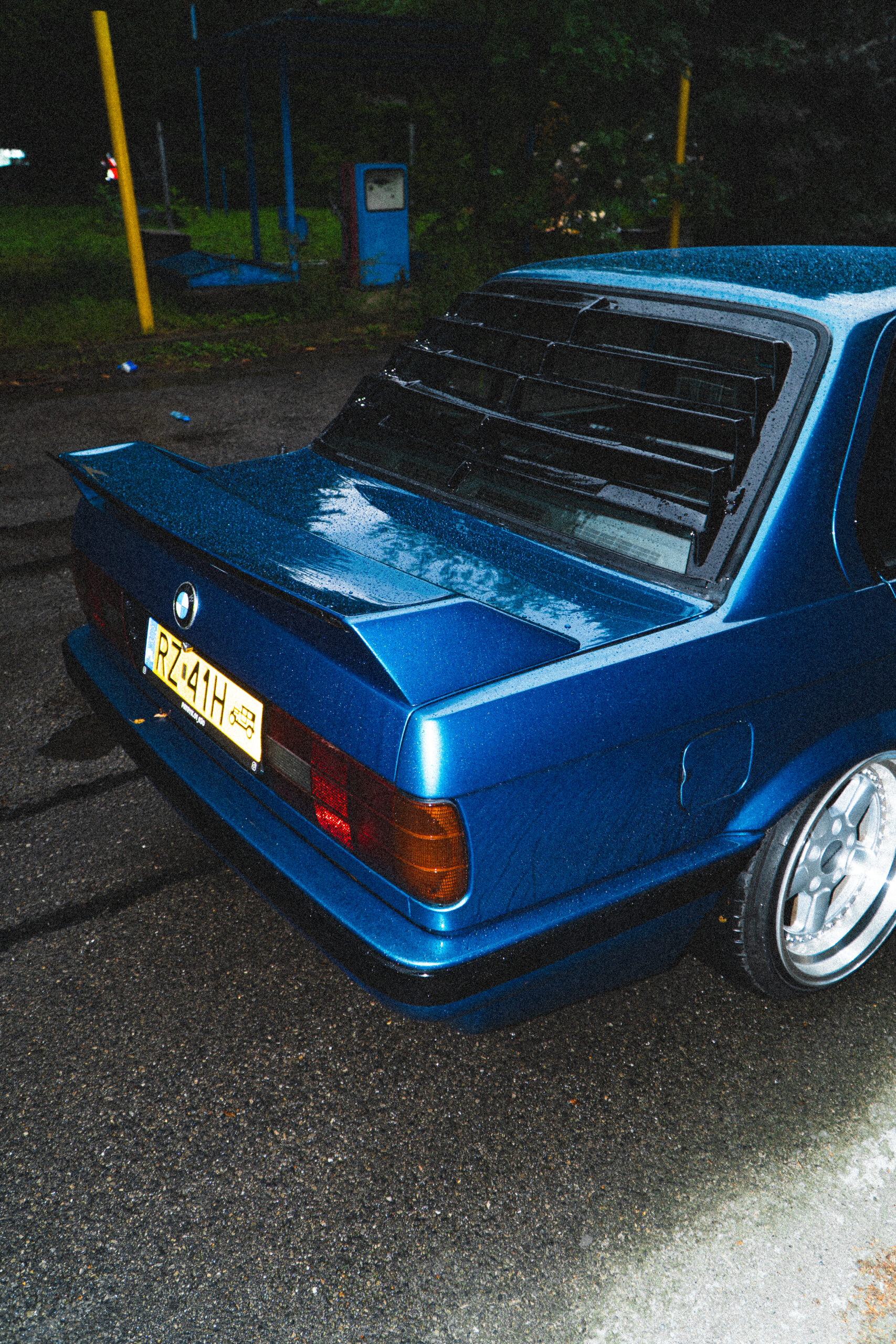 Letni deszczowy wieczór. Pustawe drogi. Asfalt połyskuje pod światłami. Trudno o lepsze warunki do jazdy drugą generacją serii 3. Niska masa, tylny napęd i wnętrze podporządkowane kierowcy. Bez ekranów, bez asystentów, bez filtrów między człowiekiem a maszyną.